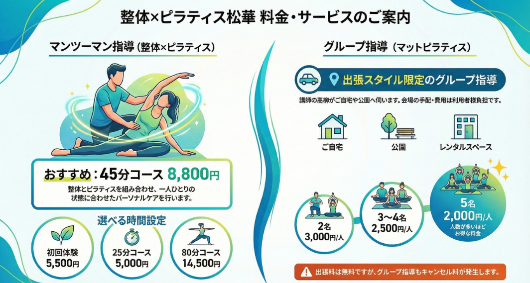 マンツーマン対応ですので別途出張料はいただきますが距離や人数に応じて料金が変わりますので都度ご相談ください