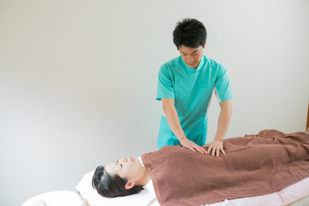 理学療法士としてこれまでの経験をもとに、お客様の「呼吸」の状態を確認し、体幹周りの筋肉がしなやかに動けているかを細かく評価し、筋肉が連動して働きやすい環境を整えていきます